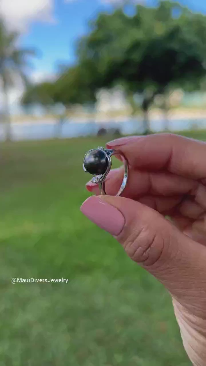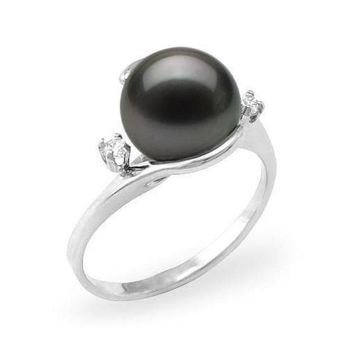 ダイヤモンドと白金のタヒチの黒真珠のリング - 9-10mm