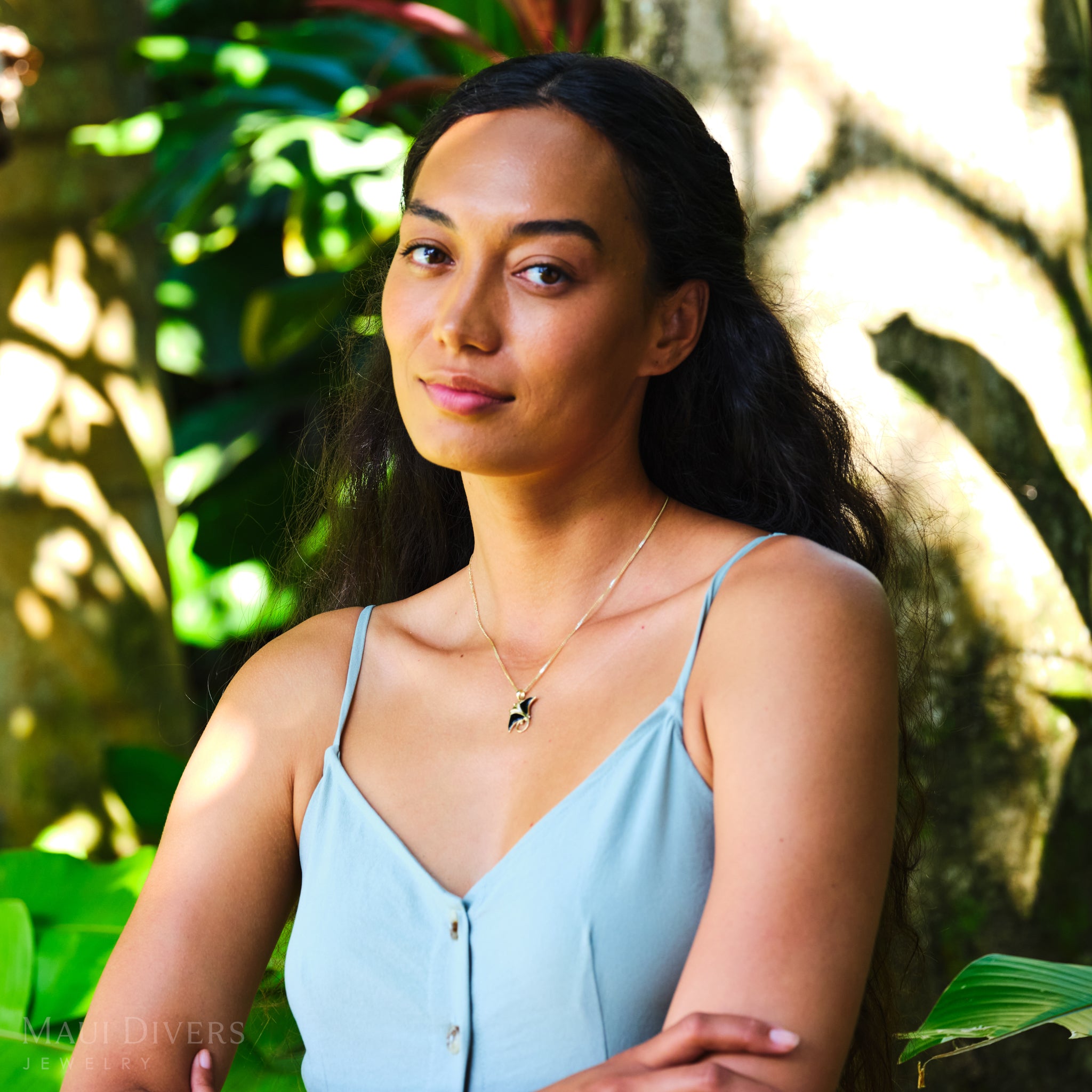 The Manta Ray Pendant from our Sealife Collection features the stunningly lustrous Hawaiʻi state gem, black coral, diamond, and gold. Locally made in Hawaiʻi, this Manta Ray Pendant is a perfect way to commemorate your trip to Maui.