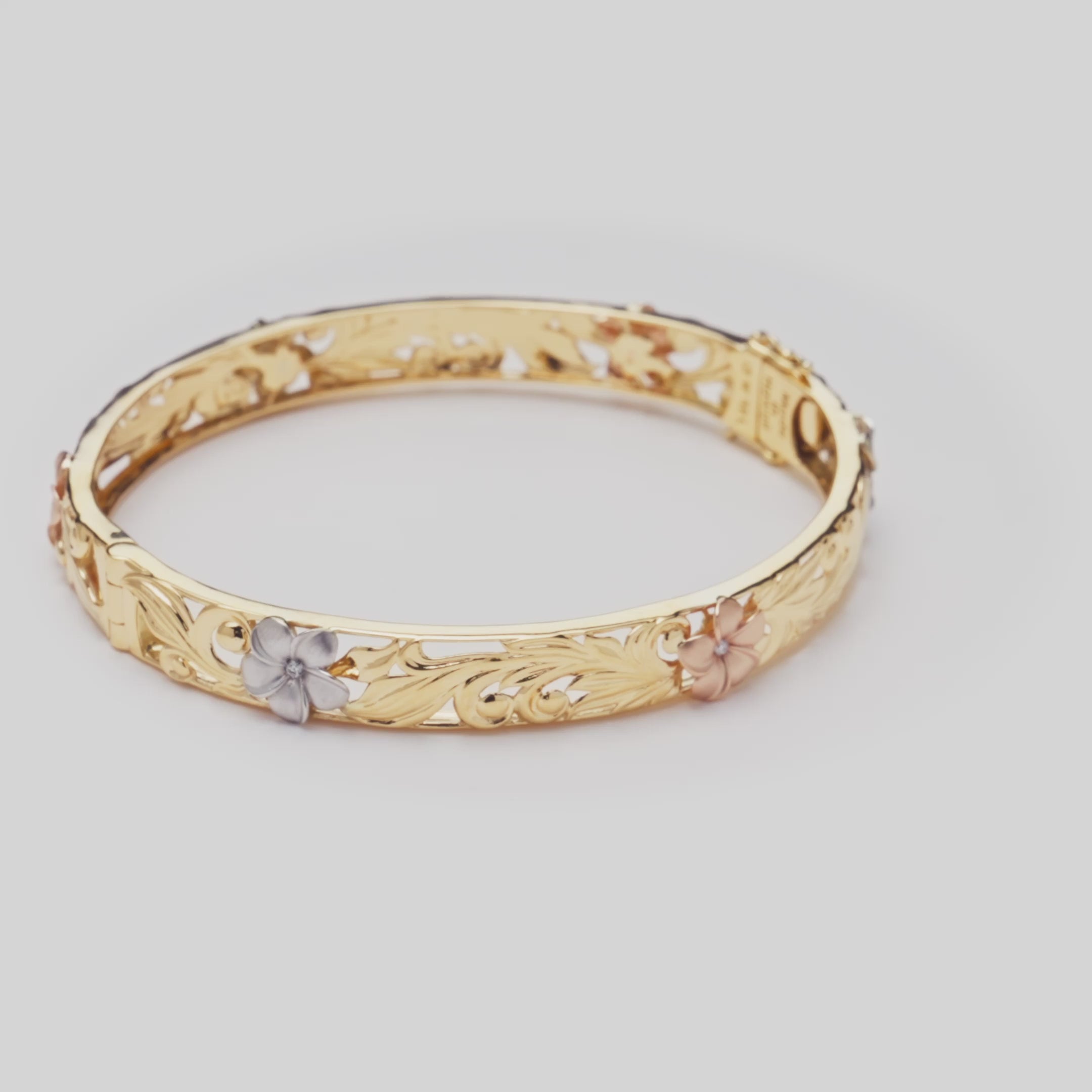 Hawaiian Heirloom Plumeria Hinge Bracelet in Tri Color Gold with Diamonds- 8mm