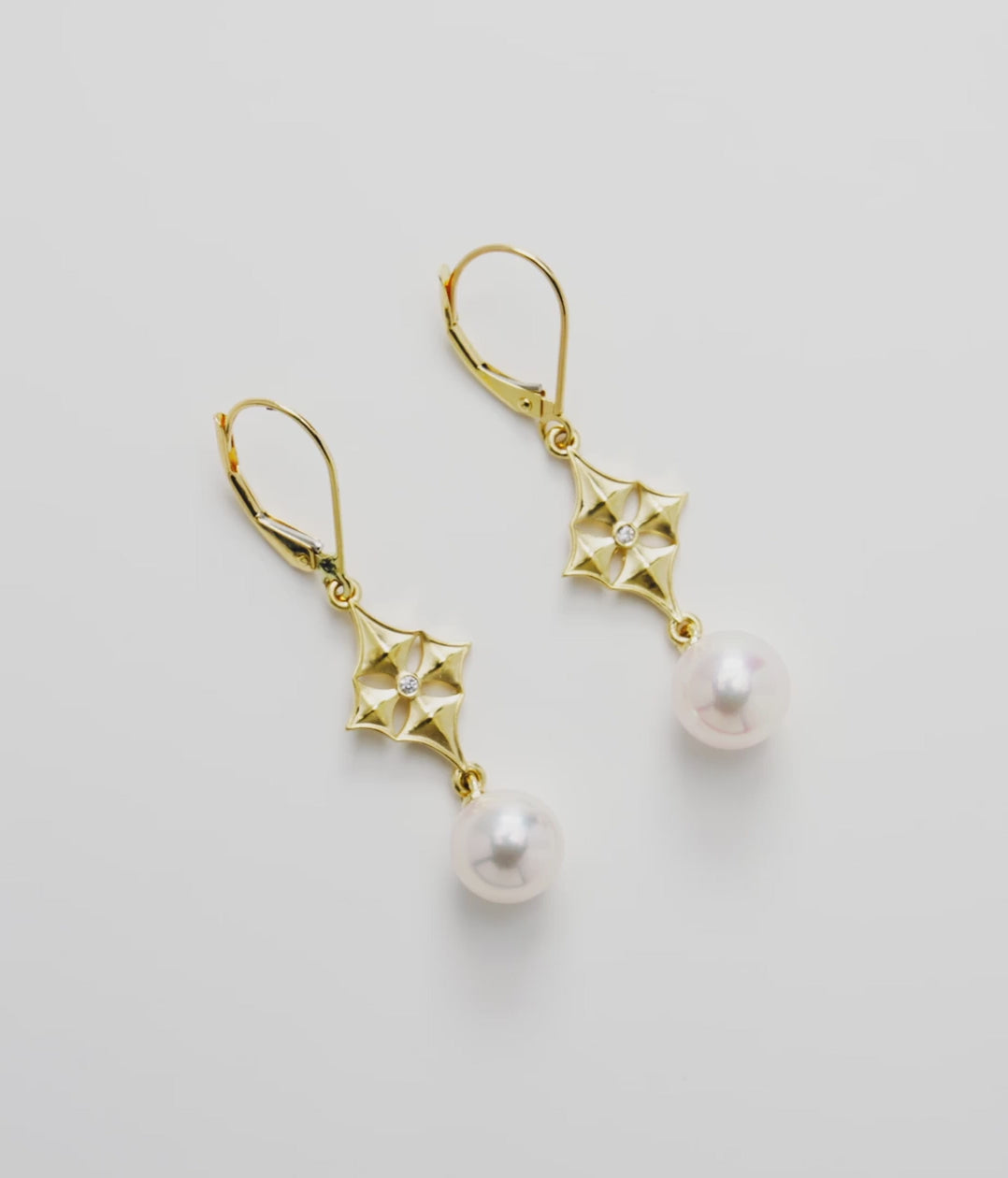 Hawaiian Quilted Star Akoya White Pearl Earrings in Gold - 8mm