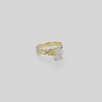 The royal beauty of the Living Heirloom Engagement Ring is undeniable. Elegant hāpu'u fern tips and vines of royal maile create its timeless scrollwork, embodying love, honor, respect, and new beginnings. The one-carat radiant solitaire lab-grown diamond completes the exquisite design with stunning sparkle at every turn.