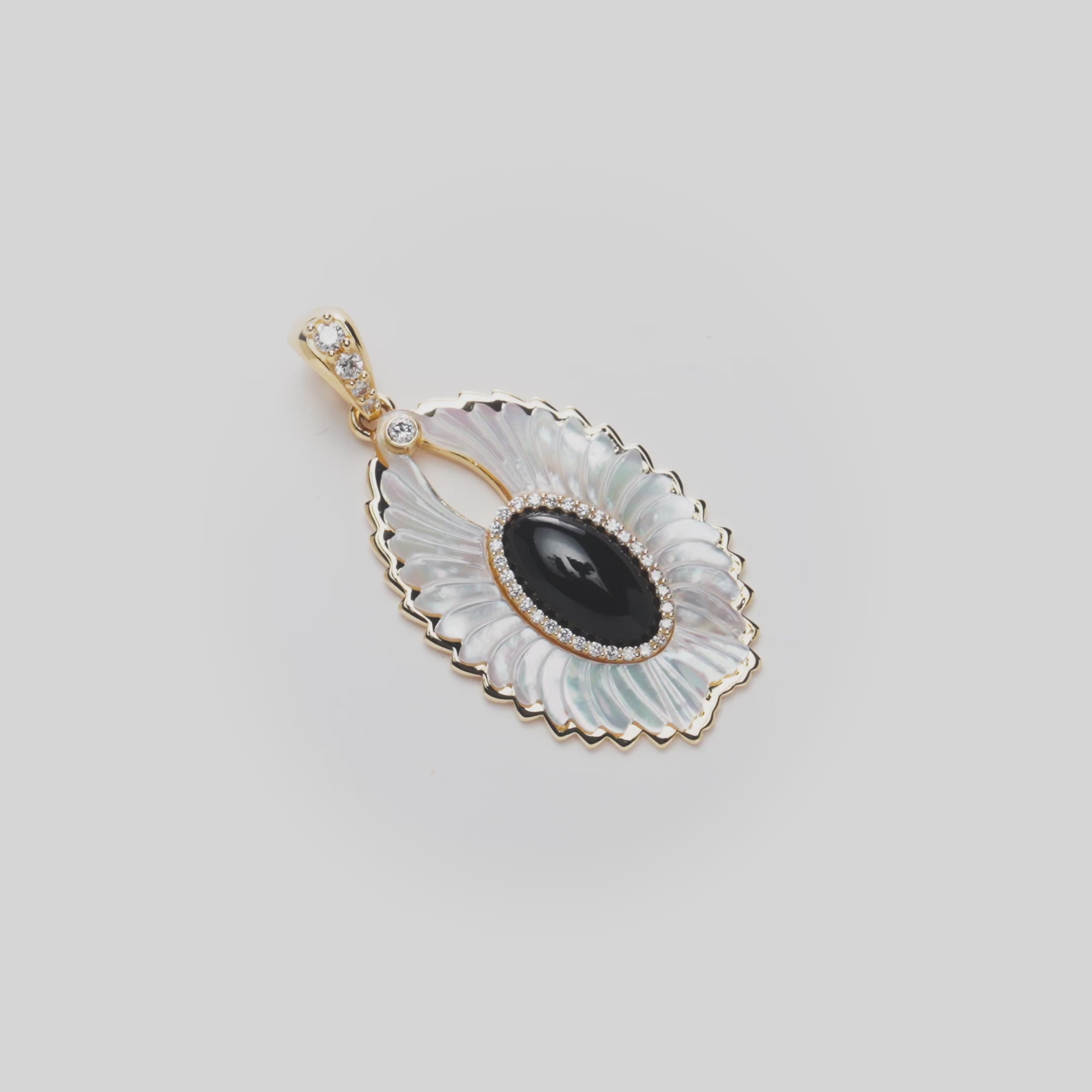 The Pueo is a Hawaiian short-eared owl that is endemic to the Hawaiian Islands. Regarded as an ʻaumakua (spiritual guardian), the pueo is recognized as a protector against danger. Artfully crafted in iridescent white mother of pearl, lustrous Hawaiian black coral, sparkling natural diamonds, and solid 14k gold, wear the pueo as a symbol of protection.